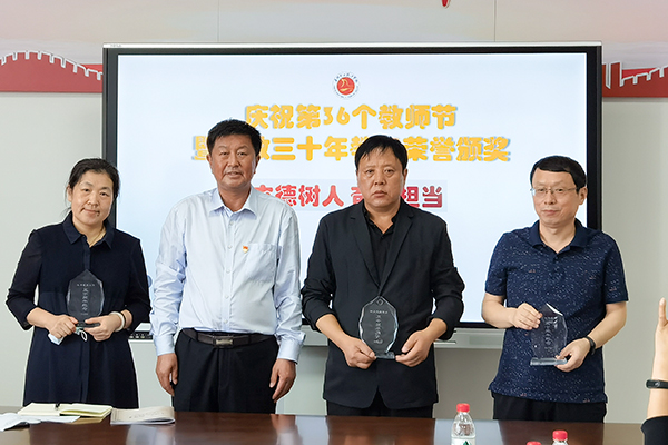 9月9日上午,在第36个教师节来临之际,学院开展以“立德树人 教书育人”为主题的第36个教师节座谈会暨从教30年教工荣誉颁奖。学院党委书记王正东、工会主席刘艳、从教满30年教工、疫情期间驻校基层单位领导和教工代表、各类优秀和专家教师代表、各分院系教师代表、辅导员代表、新进教师代表等35人参会。座谈会由学院工会主席刘艳主持。