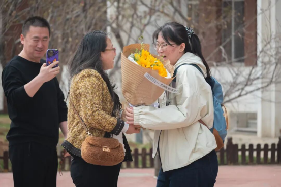 考场外,翘首以盼的家长向孩子献上鲜花与祝福,形成一道温馨的风景线。