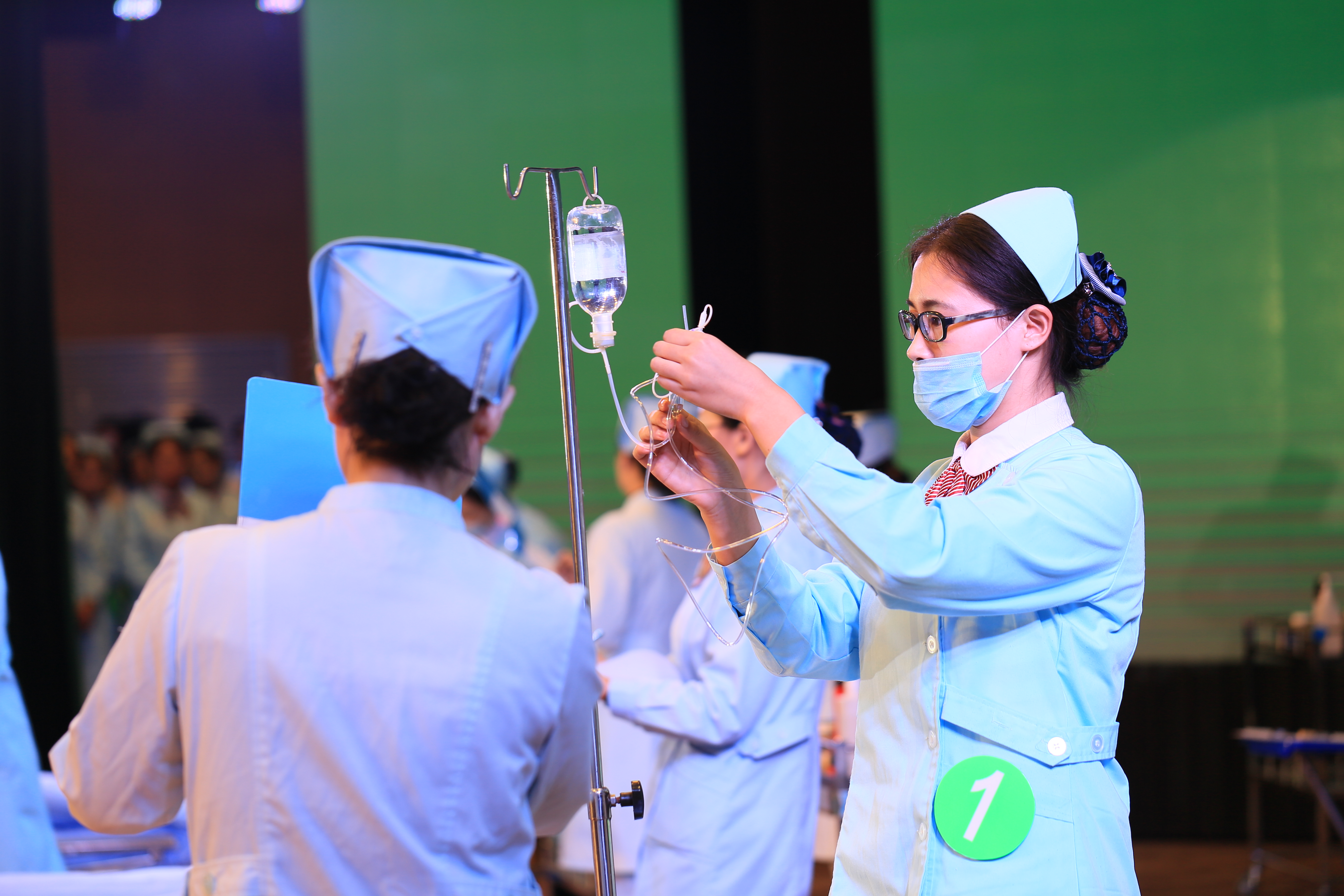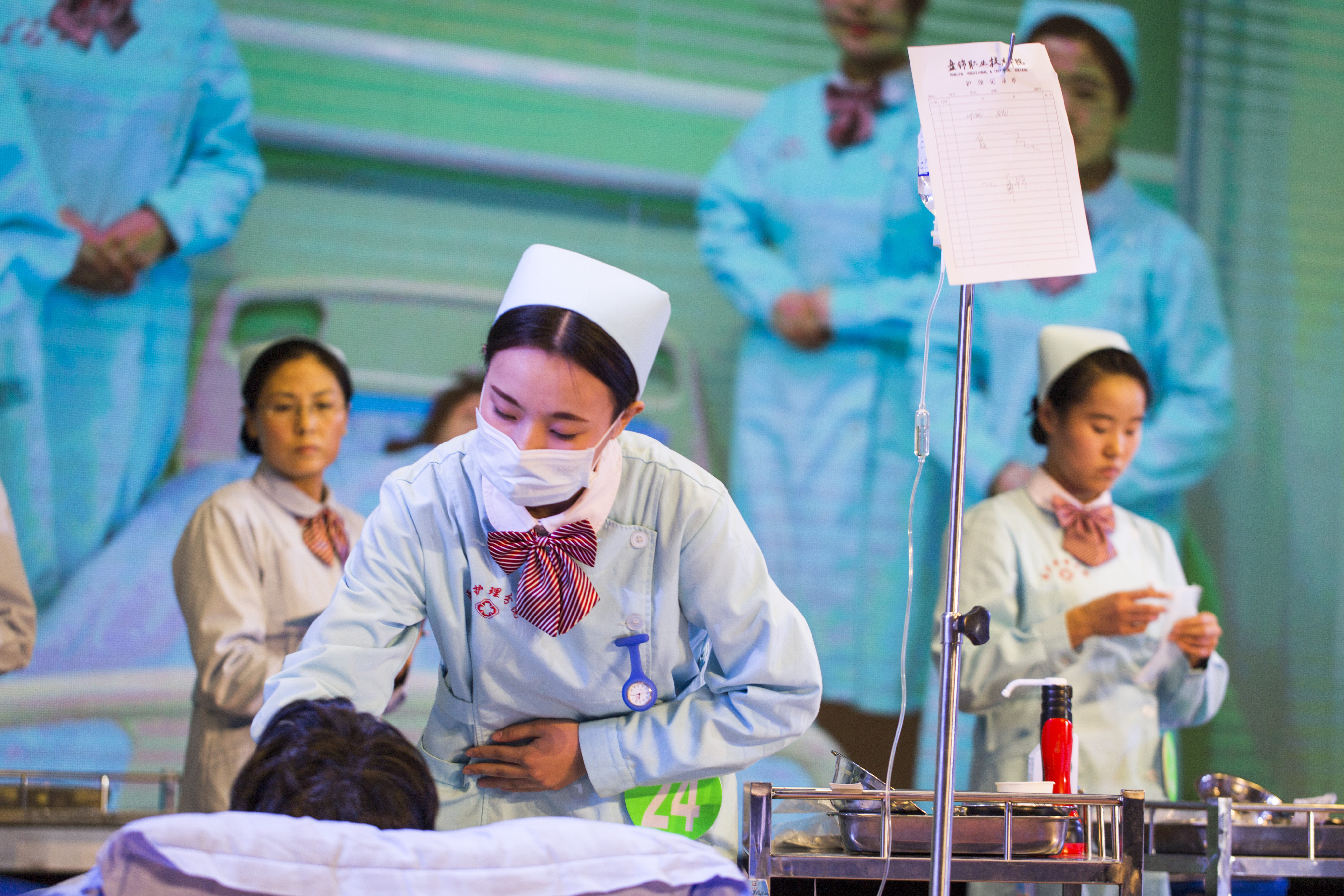 问答环节结束之后,技能部分比赛如序进行,本环节主要考察参赛选手的静脉输液技术和鼻饲技术操作等两项重要专业必备技能。参赛选手分为8组,每组4人。选手分别进行比赛。所谓台上一分钟台下十年功,选手们个个都付出了比平常更多的努力。他们台上规范的操作与细心的讲解无不体现了我分院护生精湛的专业技能。专家评委在台上认真评判并不时提出专业问题,选手们都能从容应对,回答自如,体现了专业素养。
