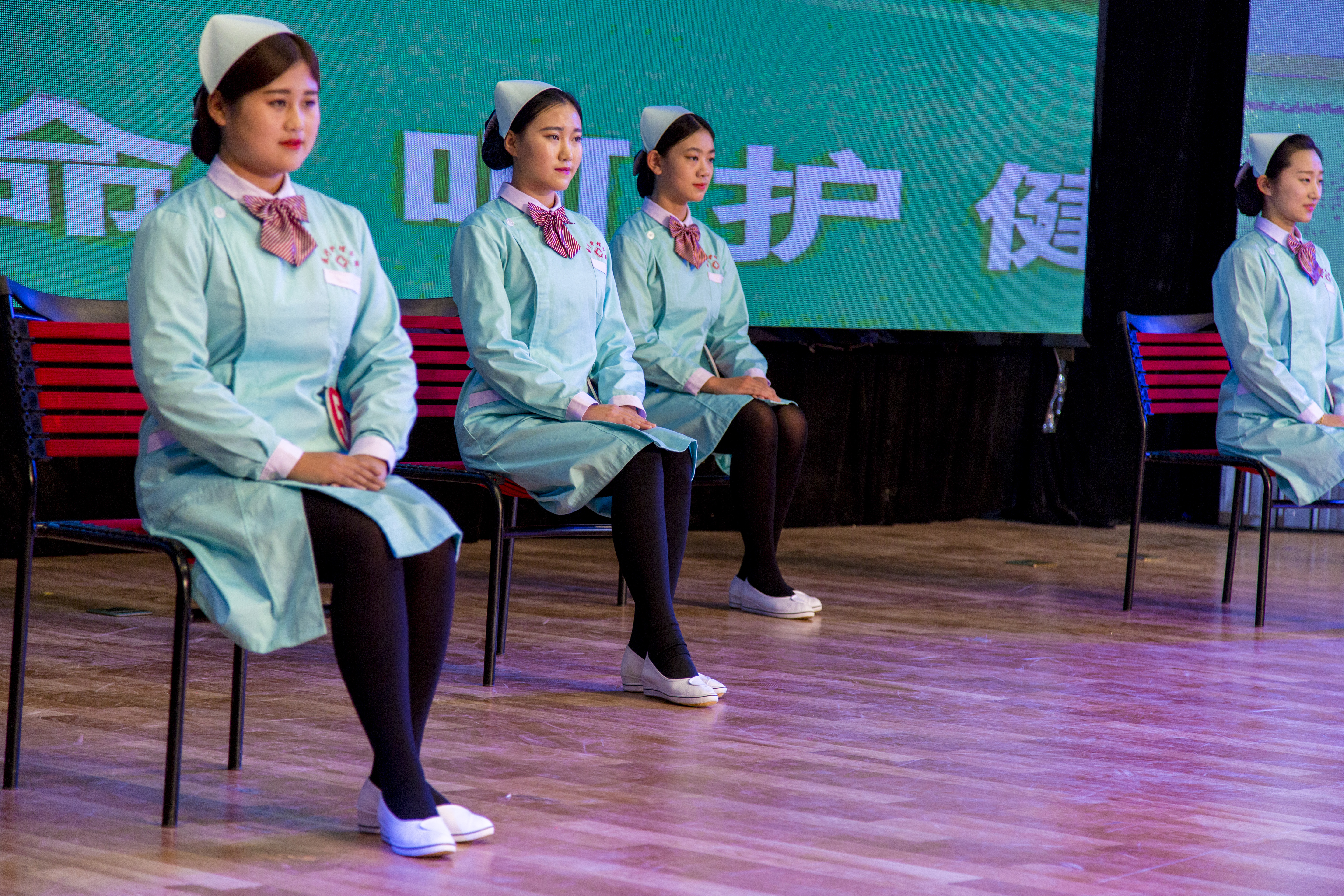 庄严的宣誓仪式过后,礼仪比赛正式开始,参赛选手分为6组,每组5人。每一位护生都身着护士服,头戴燕尾帽,面带微笑、精神饱满地按照大赛顺序依次出场。比赛主要以站姿、坐姿、走姿、端治疗盘、鞠躬为考核项目,选手们以娴熟、流畅、规范、优雅的礼仪动作和整齐划一的队形与美妙的音乐、旁白交相辉映,巧妙完美的展现出护生的青春风采和礼仪素质,赢得了现场评委和全场观众的阵阵掌声。
