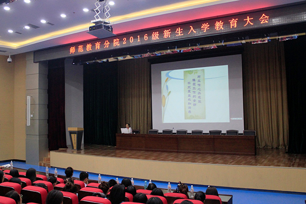 9月5日晚18:30分,师范教育分院在学院图书馆报告厅组织召开了2016级新生入学教育大会,439名新生全部参加,分院领导班子成员及辅导员、班主任老师一同参加了会议。会上,卢云峰院长和张雅洁书记分别有针对性的对分院的基本情况、新生如何过好大学时代的生活等方面进行了全面、详实的介绍和讲解,对新生可能产生的问题进行了详细解答,并对她们提出了殷切的希望。新生入学教育大会的举行为师范教育分院的高质量教育教学和全面促进学生成长、成才奠定了良好基础。