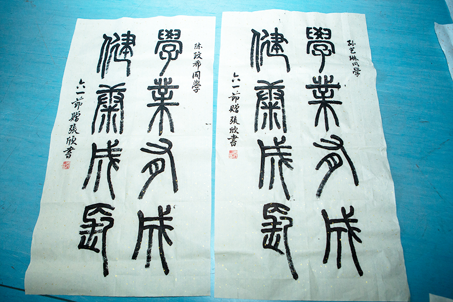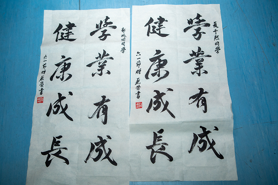 芦韵书社的张玉伟、张欣、赵子漪、韩丽荣四位老师,满怀着对新时代少年儿童健康成长的厚望,以及对中华传统书法文化的无比热爱之情,在学校图书馆二楼芦韵书社活动室,为处于基础教育阶段的22名三部教师的子女,创作了22副儿童节励学书法作品。