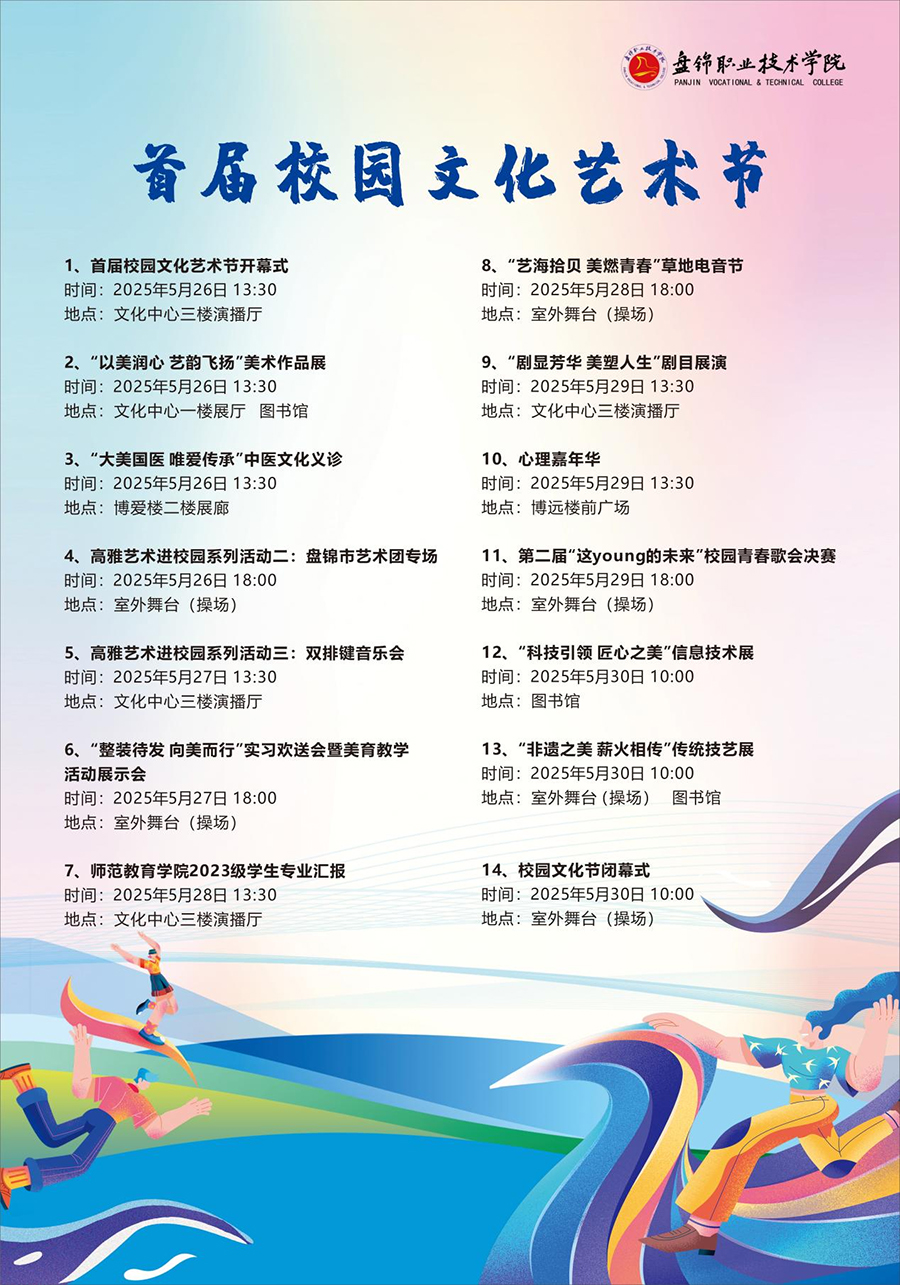 为全面贯彻党的教育方针,落实立德树人根本任务,引领学生树立正确的审美观念、陶冶高尚的道德情操、塑造美好心灵,弘扬中华美育精神,以美育人、以美化人、以美培人,丰富校园文化生活,培育德智体美劳全面发展的社会主义建设者和接班人,我校将于2025年5月26日至30日面向全校师生举办盘锦职业技术学院首届校园文化艺术节。本次文化艺术节涵盖文艺演出、艺术展览、非遗展示、科技展览、医疗义诊等多种类活动,将为全校师生呈现精彩纷呈的艺术盛宴。