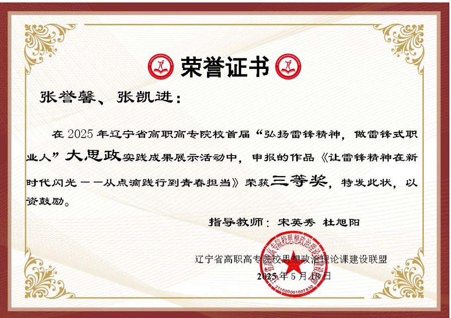 为深入贯彻习近平总书记在辽宁考察时的重要讲话和重要指示精神,大力弘扬辽宁“红色六地”文化,贯彻落实省委教育工委、省教育厅作出的《关于组织开展“弘扬雷锋精神,奋斗成就梦想”2025年春季学期“开学第一课”活动的通知》要求,在第62个学雷锋纪念日到来之际,辽宁省高职高专院校思想政治理论课建设联盟面向全省高职高专院校(包括本科院校高职专科)大学生开展了“弘扬雷锋精神 做雷锋式职业人”实践教学成果主题作品征集及展示汇报活动。活动历时两个多月,结果现已揭晓,我校选送作品喜获二、三等奖各两项。