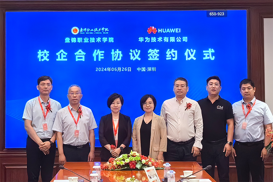 6月26日,盘锦职业技术学院与华为技术有限公司签署校企合作协议,授牌盘锦职业技术学院成立华为鲲鹏产业学院。校长宋锦、副校长李辉、教务处处长张洪雷、信息学院院长孙伟,华为技术有限公司教育行业总监李声阳、辽宁商业总经理赵梓含、辽宁中部区域商业经理姚宏斌等相关负责人出席签约仪式。签约仪式由李声阳主持,宋锦和赵梓含分别代表双方签约。