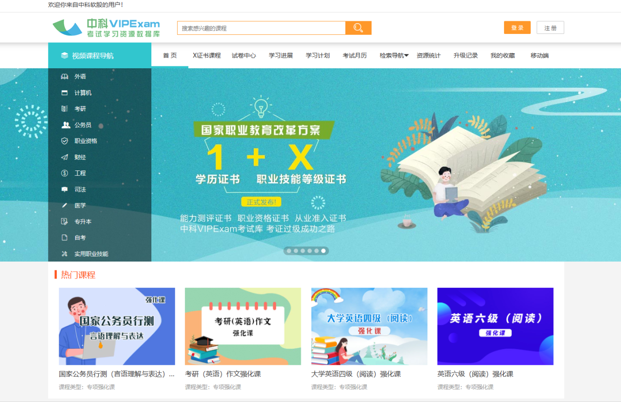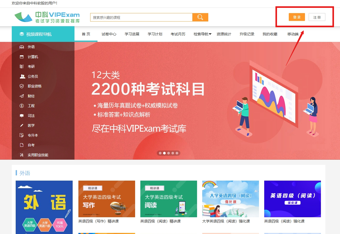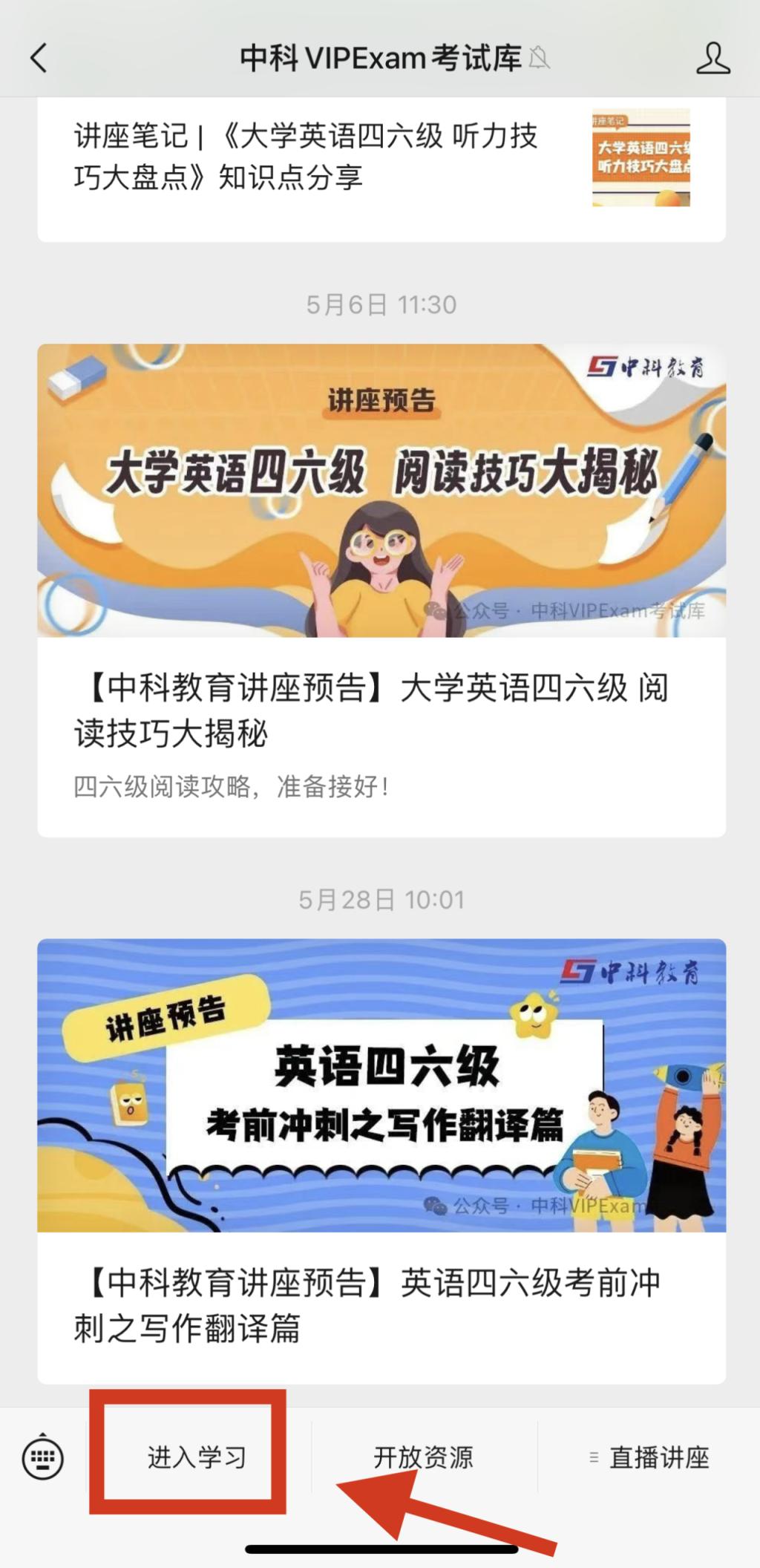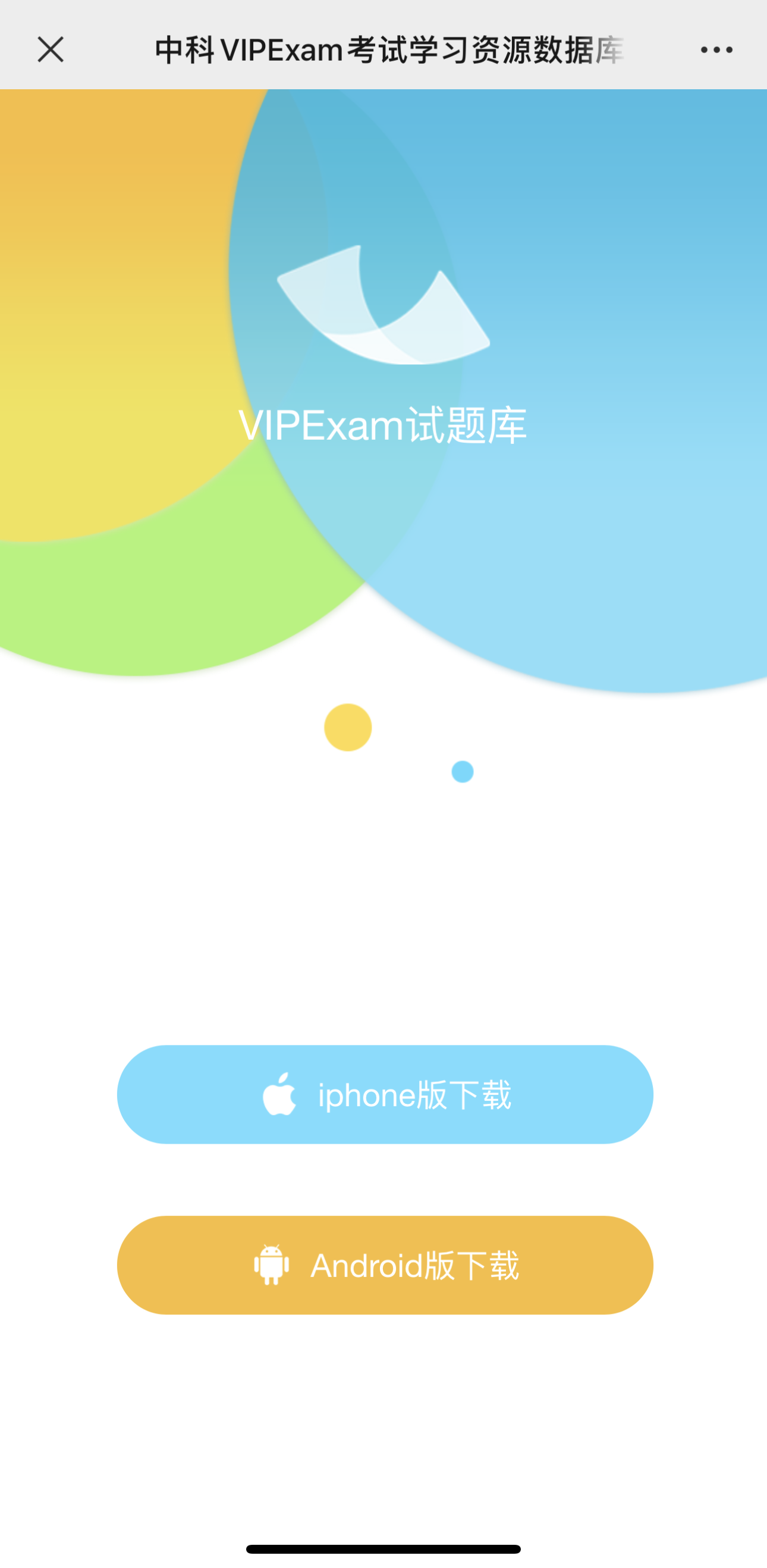 1.微信公众号:扫描下方二维码,关注“中科VIPExam考试库”微信公众号,点击“进入学习”跳转至登录页面,输入账号和密码即可畅游数据库的微信端。