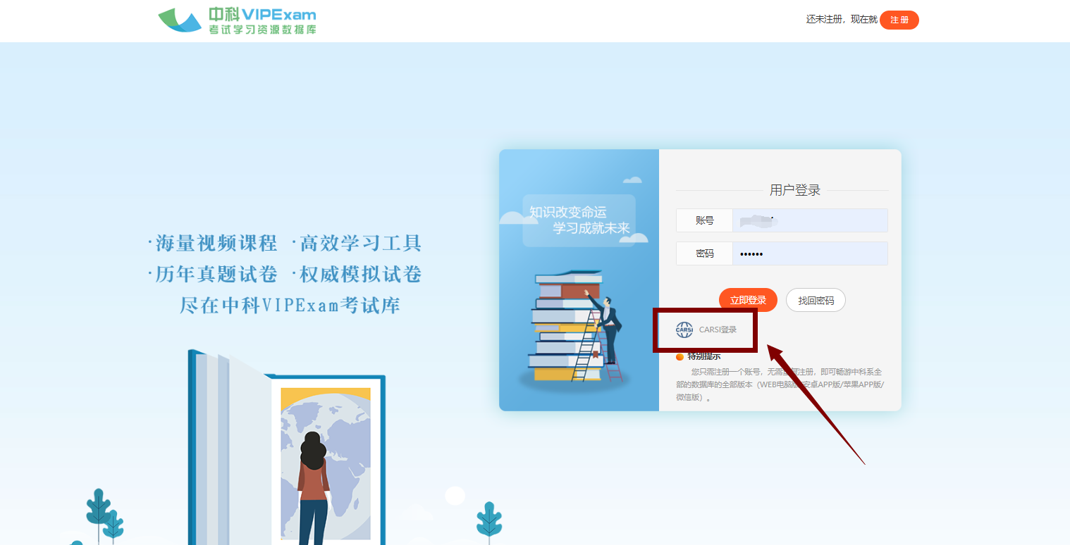 在非校园网IP范围内使用数据库时,可通过电脑浏览器访问VIPExam考试库官网www.vipexam.cn;在网页的右上角点击“登录”进入登录页面,在登录页面点击“CARSI登录”按钮,即可通过CARSI登录。