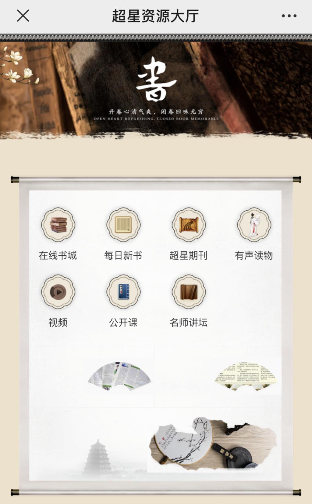 2.点击超星资源后即可进入超星资源大厅,随时使用在线书城、每日新书、超星期刊、有声读物、视频、公开课、名师讲堂等。